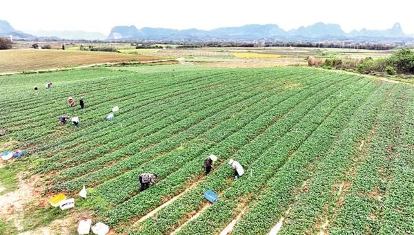3月27日,在柳州市柳城县社冲乡柳州螺蛳粉原材料基地里,农民在蔬菜基地里采摘蔬菜(无人机照片)。