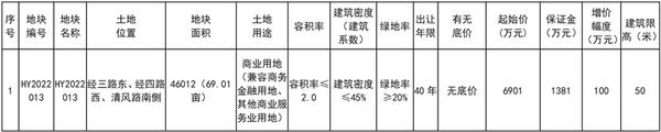 一、拍卖地块的基本情况和规划指标要求:(详见下表) 1.HY2022013号宗地地块内兼容商业设施建筑面积不得超过地上总建筑面积的30%,土地出让合同签订后,12个月内必须开工建设,工期35个月,土地成交价款需在土地出让合同签订后30日内交纳50%,受让人在支付第二期及以后各期国有建设用地使用权出让价款时,按照支付第一期土地出让价款之日中国人民银行公布的贷款利息,向出让人支付。交地时间6个月内。2.具体建设方案须报规划部门批准后实施,土地出让合同签订后,12个月内必须开工建设,工期35个月,土地成交价款需在土地出让合同签订后60日内交清,交地时间6个月内。3.根据淮政【2019】45号文件精神,竞得人摘牌土地后,应将项目施工标发包给在淮阳设立公司的施工单位;房地产开发项目非淮阳境内企业竞买人在竞买申请时,申请书中应明确成立新公司、公司出资构成及成立时间。4.土地竞买保证金必须以竞买申请人(单位)自身的名义交纳,竞买申请人(单位)与交款人(单位)名称不一致的,无法确认其竞买资格,交纳款项无效。5.具体以规划部门出具的规划指标为准,详见规划设计条件或批复文件。
