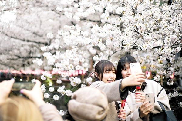 3月27日,人们在日本东京目黑川畔赏樱。 近日,东京进入樱花季,不少民众来到东京著名赏樱点目黑川观赏樱花。 新华社记者 张笑宇 摄