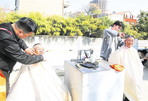 3月27日下午,在鹿邑县城风景河上善园,该县一理发店的4位年轻理发师轮流为环卫工人理发。据了解,几天前,该理发店老板郑亚杰在闫沟河附近健身时,看到几名环卫工人头发较长,便组织理发师为环卫工人义务理发。记者 侯国防 通讯员 胡洪涛 摄