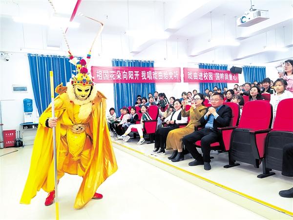 “戏曲博大精深,育我长大成人”“祖国花朵向阳开,我唱戏曲给党听”……学校报告厅内,近200名主动加入戏曲社团的学生,以及家长、老师共同见证了这一时刻。