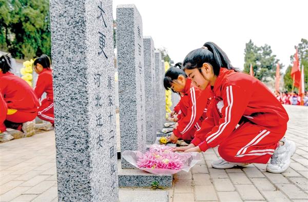 4月3日,学生在河北省遵化市铁厂镇甲山烈士陵园献花。 清明将至,各地开展祭奠活动,缅怀先烈,寄托哀思。 刘满仓 摄 (新华社发)
