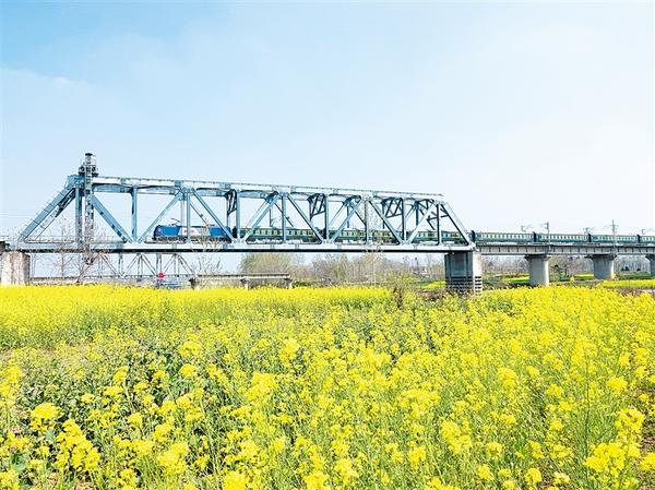 天蓝云白,油菜花烂漫。漯阜铁路运输线上,一列列“钢铁长龙”在芬芳中穿行。4月2日,一列火车行驶在沈丘县周营镇境内,正穿越一座沙颍河铁路桥。