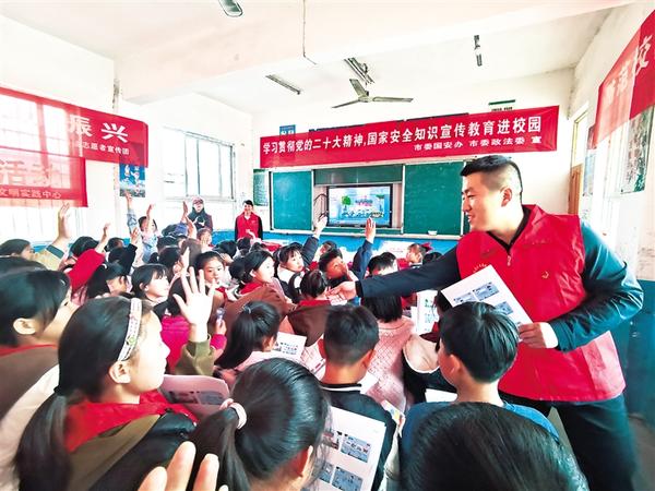 4月7日,市委国安办、市委政法委、郸城县委国安办组织周口市法学会驻村第一书记普法志愿者宣传团在郸城县汲冢镇丁寨小学开展“4·15”全民国家安全教育主题活动。活动由市委政法委驻村工作队王景瑞授课,采用领学画报、观看视频、现场问答等形式,向小学生普及国家安全和校园安全常识。活动中,主办单位向学校捐赠成长红绿灯普法微电影36部、普法画报和普法教育读本600册、儿童防晒服100套、文具书包等300余套。记者 陈永团 摄