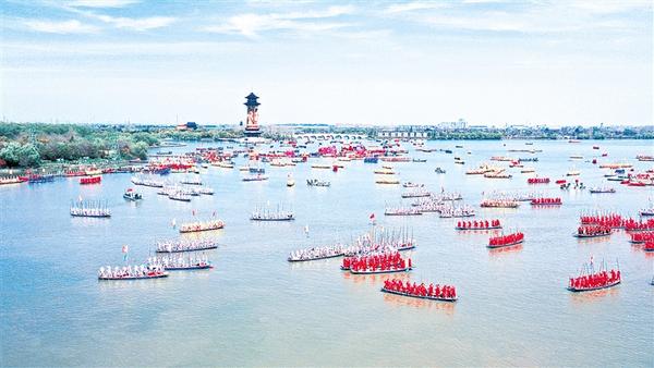 当日,2023年泰州姜堰溱潼会船节在江苏省泰州市姜堰区溱湖国家湿地公园开幕,数百条船只和万余名会船选手云集溱湖,演绎历久弥新的民俗画卷。