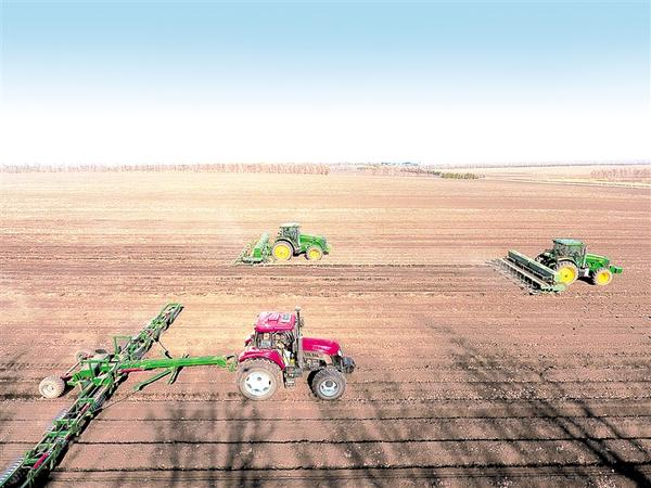 天气渐暖,“大粮仓”黑龙江省迎来春耕季。近日,位于黑龙江省北安市的北大荒集团建设农场有限公司启动农田春耕生产作业,该农场组织28台大型拖拉机对即将播种的玉米和大豆农田进行分层定量施肥作业,同步对完成施肥的地块进行镇压保墒作业。30余万亩玉米和大豆农田的施肥与镇压保墒作业将于4月15日左右完成,以确保接下来的播种作业顺利进行。新华社记者 王松 摄