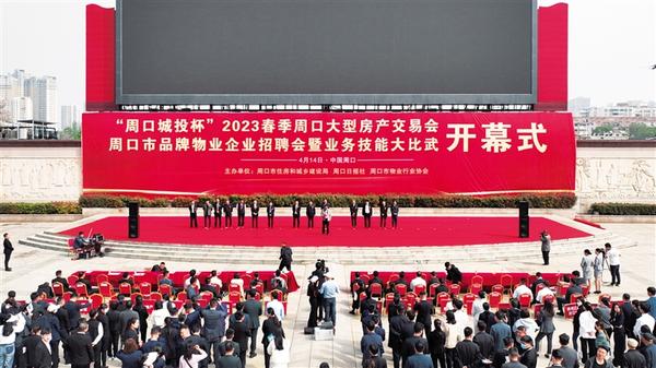 4月14日上午,由市住房和城乡建设局、周口日报社、市物业行业协会共同主办的“周口城投杯”2023春季周口大型房产交易会、周口市品牌物业企业招聘会暨业务技能大比武开幕式在市五一文化广场隆重举行。