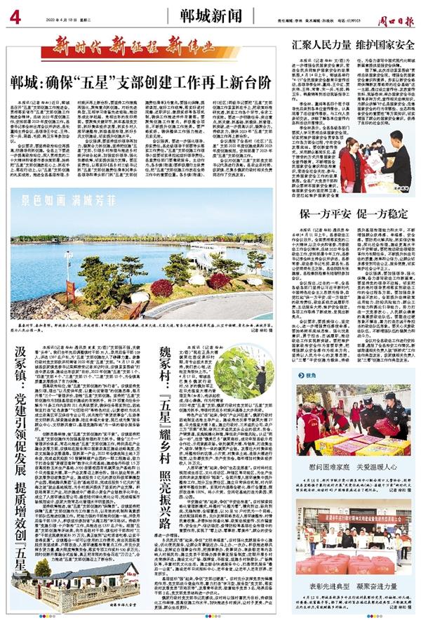 本报讯(记者 徐松 通讯员 楚震 文/图)“支部强不强,关键看‘头羊’。我们去年先后调整镇村干部35人,录用后备干部109人,评选1337名户长,为‘五星’支部创建注入了磅礴力量。谢寨行政村党支部获评河南省2022年度‘五星’支部。”4月17日,郸城县汲冢镇党委书记梁辉接受记者采访时说,该镇紧紧围绕“打造中原名镇、建设出彩汲冢”目标,2022年创建“五星”支部1个、“四星”支部4个、“三星”支部15个、“二星”支部10个,为全镇高质量发展提供了有力保障。