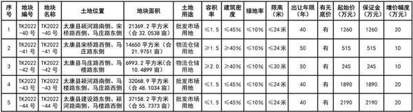 一、拍卖地块的基本情况和规划指标要求(详见下表) 备注:1.竞买人(单位)竞得土地后,须签订《土地出让合同履约保证协议书》,在签订《国有建设用地使用权出让合同》之前,按照成交价款的5%交纳履约保证金。2.TK2022-40号、TK2022-43号、TK2022-44号为农产品批发市场用地,TK2022-41号、TK2022-42号为物流仓储用地,须严格执行《国务院办公厅关于促进物流业健康发展政策措施的意见》(国办发〔2011〕38号)文件有关规定,土地出让后严禁擅自改变用途从事商业性房地产开发。3.执行地块控制性详细规划,具体以宗地规划条件为准。