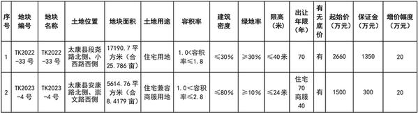 一、拍卖地块的基本情况和规划指标要求(详见下表) 备注:1.竞买人(单位)竞得土地后,须签订《土地出让合同履约保证协议书》,在签订《国有建设用地使用权出让合同》之前,按照成交价款的5%交纳履约保证金。2.配建社区养老服务设施按照《周口市住宅小区配建社区养老服务设施规划、建设、移交与管理办法(试行)》文件精神执行。3.TK2023-4号宗地带设计方案出让,出让后不得改变设计方案进行建设。4.执行地块控制性详细规划,具体以宗地规划条件为准。