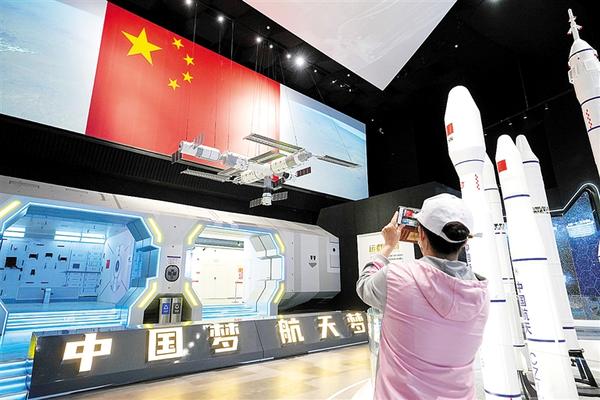 4月24日,观众在中国航天博物馆拍摄展出的空间站模型。