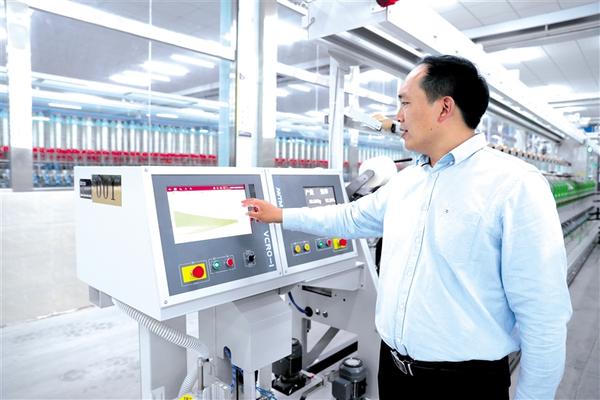 在粗细络联系统前,记者看到,粗纱通过自动运输系统,进入细纱的生产环节,原本一些需要人工操作的环节,也实现了自动化。“这个系统把原来的三个生产车间,变成了一个生产车间,实现了从粗纱到细纱再到筒纱的全过程,形成一个闭环系统。”张东森介绍,在细纱的环节,他们拥有国内最长的细纱机,单台细纱机的纱锭达到1824锭,并配备了世界先进的单锭监测系统,对产品的质量和设备情况,进行实时监控。另外,在自动络筒机上,配备了电子清纱监测系统,实时监测纱线的内在质量,实现了精细化管理。
