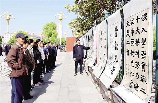 “五一”前夕,中国书法之乡郸城县先后举办“学习二十大 奋进新征程”庆“五一”职工书法作品展、“学习二十大 建功新郸城”暨庆“五一”迎“五四”书法展、老干部书画展等活动,以浓浓墨香宣传党的二十大精神、庆祝劳动节、弘扬劳动精神。记者 徐松 通讯员 陈吴陆 摄