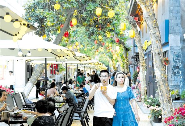 5月4日,食客行走在新昌县小吃集聚区南街“碳水王国”。