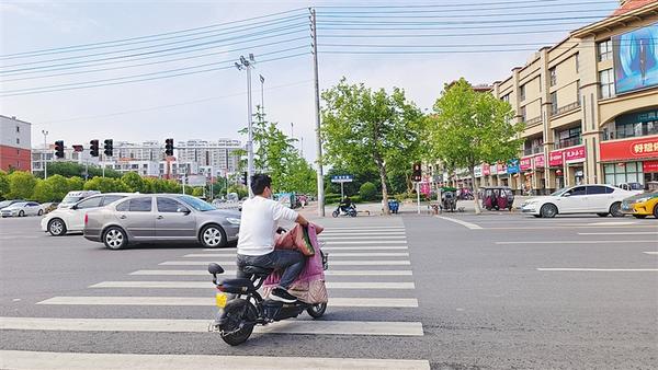 行人骑电动车、三轮车不戴头盔现象较为普遍。图为5月9日,记者在周口市中心城区部分路口抓拍的镜头。记者 刘俊涛 摄