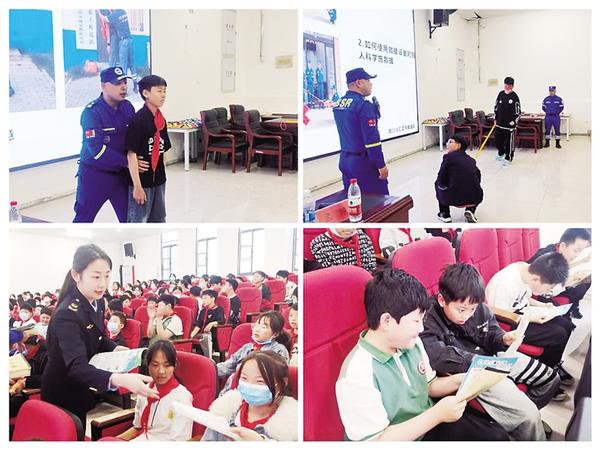 活动中,周口川汇蓝天救援队队员为学生现场讲解和演示儿童防溺水、地震自救、火灾逃生等防灾减灾知识。周口市应急管理局党员志愿者为学生发放防灾减灾知识宣传页400余张。
