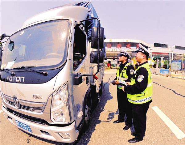5月12日,周口高速交警支队一大队民警在宁洛高速服务站向入市车辆发放宣传单,提醒大家争做“文明好司机”。记者 刘俊涛 通讯员 郭利军 摄