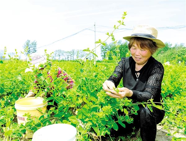 在汲水镇孙庄行政村,10多位老太太每人搬个小马扎正在金银花田里忙着采摘。83岁的付学荣一天还能摘四五斤、挣30多元工钱,71岁的刘喜兰手脚麻利,每天能摘十多斤、挣80多元工钱。大家坐在田间一边唠嗑一边挣钱,其乐融融。