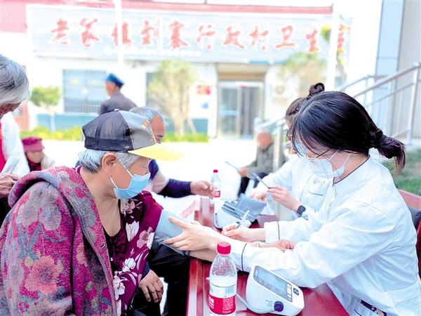 5月12日上午,周口市中心医院组织神经内科、疼痛科、泌尿科等科室医护人员到太康县老冢镇刘寨村开展“走基层、献爱心、送健康”义诊活动,免费为群众测量血糖、血压,做心电图、彩超,受到群众一致好评。图为医护人员为群众测量血压。