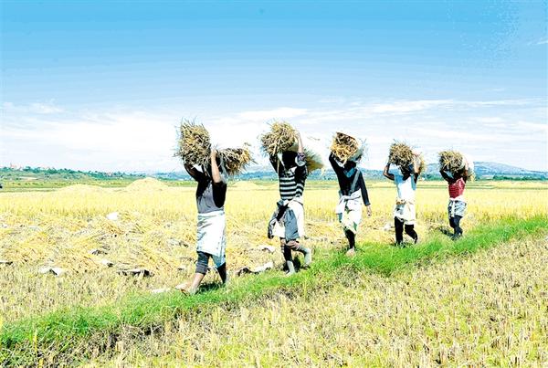 5月12日,在马达加斯加首都塔那那利佛附近马希奇镇的中国国家杂交水稻工程技术研究中心非洲分中心,当地农民在杂交水稻高产示范田内收割水稻。