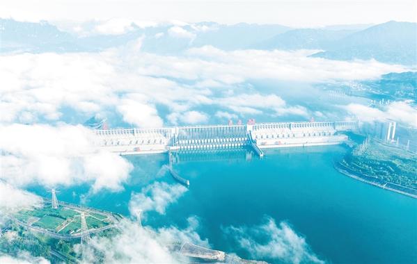 当日,湖北宜昌雨过天晴,三峡上空云雾缭绕,美景如画。