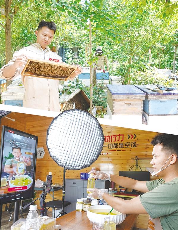 5月22日,在沈丘县付井镇九里村一个生态蜜蜂养殖基地,人称“蜜蜂哥”的退伍军人苏尚方一会儿察看蜜蜂状态,一会儿通过网络销售蜂蜜,忙得不可开交。近年来,沈丘县一些乡镇采取“合作社+基地+农户”捆绑抱团模式,发展养蜂场及养蜂合作社100余家,并通过电商平台,年销售油菜花蜜、槐花蜜等各类蜂蜜300余吨,经济效益非常可观,为乡村振兴增添了动力。 谢辛凌 摄