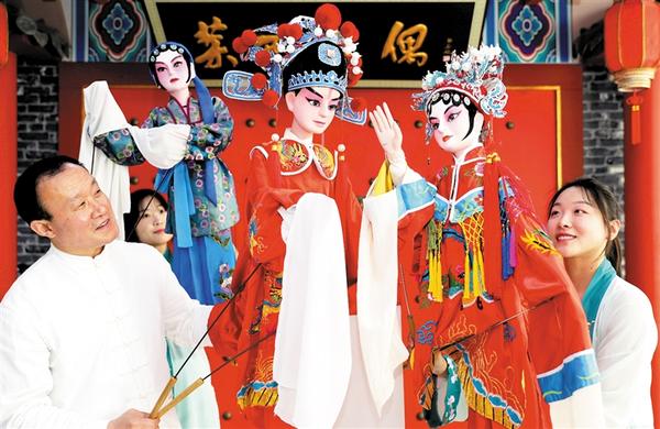 5月21日,在山东青岛,姜玉涛(左一)和演员们在排练木偶戏。 山东莱西木偶艺术有着两千多年的历史,新一代传承人姜玉涛根据时代特点和大众需求,改革木偶制作工艺、创新演出剧目,在剧目中融入童话、动漫、神话等元素,让木偶表演形式更加贴近当代生活,得到年轻人的喜爱。近年来,姜玉涛和他的团队多次开展进校园、进工地、进社区、进景区活动,古老的木偶艺术焕发出勃勃生机。张进刚 摄(新华社发)