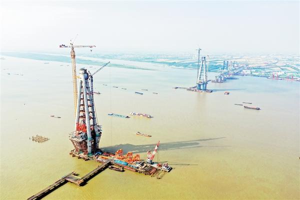 建设中的常泰长江大桥(5月21日摄)。 常泰长江大桥连接江苏常州和泰州两市,全长10.03公里,是一座集高速公路、城际铁路和普通公路为一体的过江通道。目前,大桥建设正在有序推进中。 新华社记者 季春鹏 摄