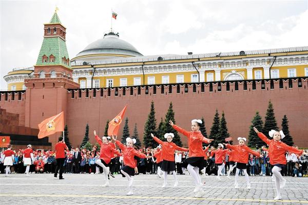 5月21日,在俄罗斯首都莫斯科,孩子们在少先队入队仪式上表演。 当日,俄罗斯莫斯科举行少先队员入队仪式,纪念少年先锋队成立101周年。 亚历山大 摄(新华社发)