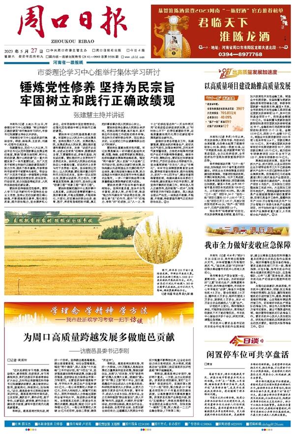 就做好当前各项重点工作,张建慧强调,要坚决抓好粮食生产,密切关注天气变化,加强会商研判,及时发布气象预警信息,力争把本轮降雨对麦收产生的不利影响降到最低,确保丰产丰收、颗粒归仓。要切实扛牢耕地保护责任,严厉打击违法占用耕地行为,坚决遏制耕地“非农化”、防止“非粮化”,牢牢守住保障国家粮食安全底线。要持续完善治理体系、提升治理能力,依托“一中心四平台”,健全完善网格管理机制,构建共建共治共享的工作格局,建设更高水平的平安周口。要坚持不懈抓好党建工作,树牢选人用人正确导向,选好配强“一把手”,加强领导班子和干部队伍建设,深入推进全面从严治党,一体推进不敢腐、不能腐、不想腐,持续营造风清气正的良好政治生态。②15