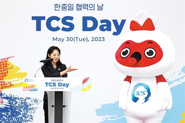 5月30日,在韩国首尔举办的“中日韩合作之日”庆祝活动中,中日韩合作秘书处副秘书长坂田奈津子介绍秘书处吉祥物。