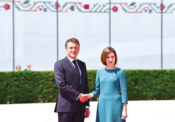 6月1日,在摩尔多瓦布尔博阿克,摩尔多瓦总统桑杜(右)欢迎前来参加第二届欧洲政治共同体领导人会议的法国总统马克龙。 第二届欧洲政治共同体领导人会议6月1日在摩尔多瓦布尔博阿克举行。近50名欧洲国家和地区领导人与会,讨论欧洲安全、能源韧性及互联互通等议题。新华社记者 连漪 摄