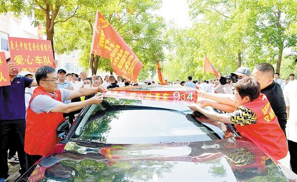 昨日,鹿邑县举行2023年“爱心助考”活动启动仪式。据悉,该县由1000余辆公交车、出租车、网约车、私家车组成的“爱心送考”车队,将在高考期间全力帮助考生安全、顺利抵达考场。图为志愿者正在为一辆私家车贴上“爱心送考”的车贴。记者 侯国防 摄