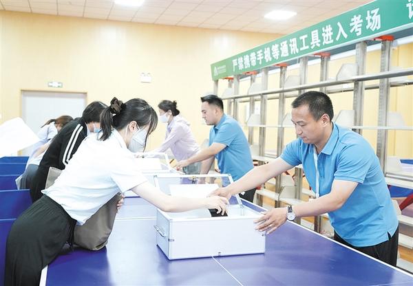 6月6日,在北京中国农业大学附属中学考点,考务人员进行高考考前演练。