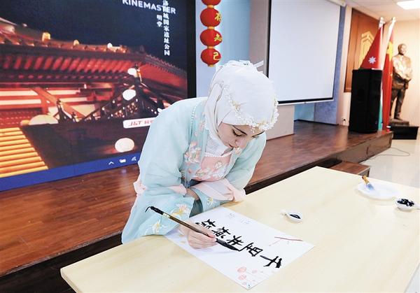 6月5日,在约旦首都安曼,一名选手在“汉语桥”世界大学生中文比赛约旦赛区决赛上展示才艺。