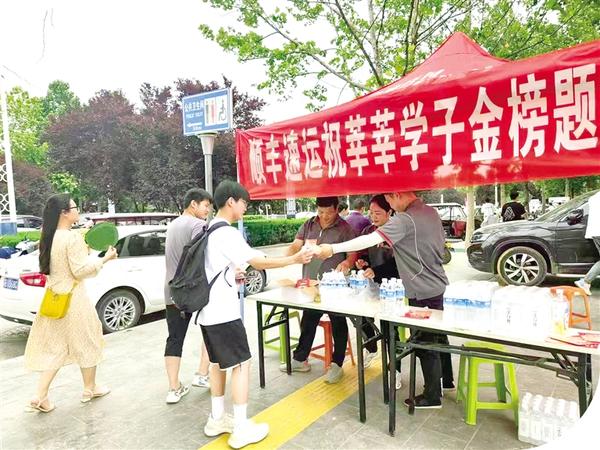 “你好同学,给你开水,小心烫。”“这位家长,送您一把扇子,请坐着休息一下。”“这儿有风油精,可以提神醒脑,加油。”因为刚下过雨,放晴的天气闷热潮湿,站在户外一会儿就会大汗淋漓,然而这样的条件没有阻挡考生父母等候在考场外的决心。爱心企业、商家、社会团体、文明单位组织志愿者设立爱心服务点,精心准备各类解暑饮品、用具及考试用具等物品,为考生及家长提供志愿服务,助力高考顺利进行。