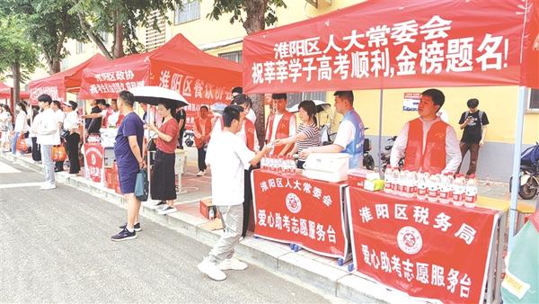 6月7日至8日,在淮阳区各个高考点附近,众多志愿者和道德文明使者为考生及家长准备了饮用水、湿巾、扇子、防暑药品,用爱心助力高考,营造了文明和谐的浓厚氛围。记者 侯俊豫 通讯员 淮格 摄