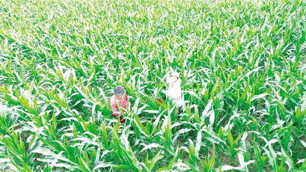 图3: 6月7日,淮阳区临蔡镇大李村村民正在春玉米地里追肥。