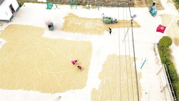 图6:6月7日,淮阳区临蔡镇许桥村文化广场上,志愿者帮助村民晾晒刚刚收获的小麦,不远处的党旗迎风飘扬。