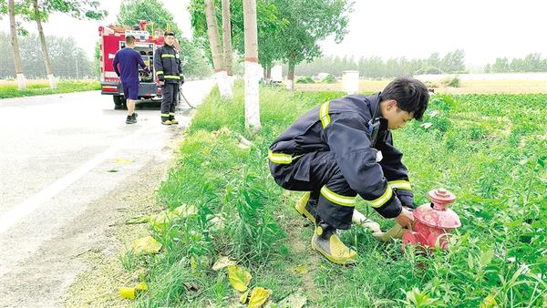 图4: 6月7日,淮阳区临蔡镇消防站的队员们正在向消防车里加水,做好随时处理警情的准备。