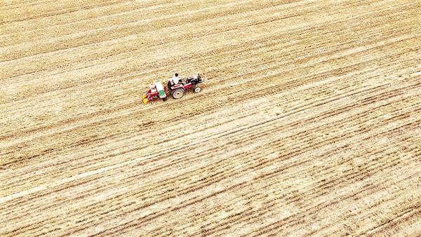 图2: 6月6日,周口市示范区许湾街道办事处一处农田里,农机手正在播种玉米。