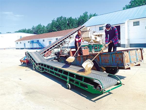 近日,在太康县大许寨镇粮油购销有限公司,工人用铁锹将新收的小麦放到输送机上,通过输送机把小麦运到粮库。据介绍,当前,太康正全力抓好夏粮收购工作,确保粮食安全。 记者 张洪涛 摄