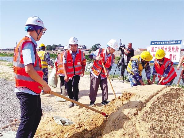 本报讯 (记者 牛思光 文/图) 6月9日下午,在平漯周高铁跨贾鲁河特大桥施工现场,一场在建高速铁路项目防汛应急救援演练正在举行。演练由河南高速铁路有限公司主办,中铁七局平漯周高铁站前八标项目经理部、北京铁研平漯周高铁监理八标项目部承办。