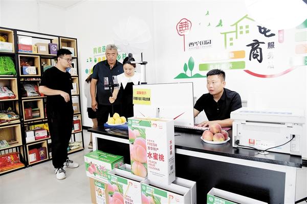6月13日,西华县黄桥乡裴庄电商物流服务站内,电商人员正在直播销售水蜜桃。黄桥乡裴庄行政村是西华“万亩桃源”景区核心区,近年来,该村大力推进“万亩桃源”提升工程,已经成为全省连片种植规模最大、全国品种最多的桃树种植基地。
