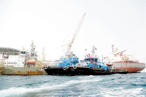 这是6月12日在也门荷台达附近海域拍摄的联合国工程船和“萨菲尔”号油轮。