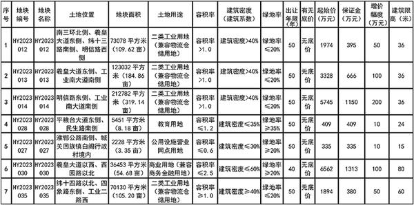一、拍卖地块的基本情况和规划指标要求:(详见下表) (1)HY2023012号宗地为工业用地“标准地”出让,“标准地”控制性指标为:入驻的具体产业类型为装卸搬运和仓储业,投资强度不低于260万元/亩,亩均税收不低于6万元/亩,具体由周口先进制造业开发区管委会负责监督监管。竞得者需与周口先进制造业开发区管委会签订《工业用地“标准地”履约监管协议》,并出具《“标准地”企业信用承诺书》;行政办公和生活服务设施用地占地面积不得超过总用地面积的7%,建筑面积不得超过总建筑面积的15%,严禁建造成套住宅、宾馆、专家楼和培训中心等非生产性配套设施。土地出让合同签订后,12个月内必须开工建设,工期35个月,土地成交价款需在土地出让合同签订后60日内交清,交地时间6个月内。(2)HY2023013号宗地为工业用地“标准地”出让,“标准地”控制性指标为:入驻的具体产业类型为通用设备制造业,投资强度不低于260万元/亩,亩均税收不低于6万元/亩,具体由周口先进制造业开发区管委会负责监督监管。竞得者需与周口先进制造业开发区管委会签订《工业用地“标准地”履约监管协议》,并出具《“标准地”企业信用承诺书》;行政办公和生活服务设施用地占地面积不得超过总用地面积的7%,建筑面积不得超过总建筑面积的15%,严禁建造成套住宅、宾馆、专家楼和培训中心等非生产性配套设施。土地出让合同签订后,12个月内必须开工建设,工期35个月,土地成交价款需在土地出让合同签订后60日内交清,交地时间6个月内。(3)HY2023014号宗地为工业用地“标准地”出让,“标准地”控制性指标为:入驻的具体产业类型为通用设备制造业,投资强度不低于260万元/亩,亩均税收不低于6万元/亩,具体由周口先进制造业开发区管委会负责监督监管。竞得者需与周口先进制造业开发区管委会签订《工业用地“标准地”履约监管协议》,并出具《“标准地”企业信用承诺书》;行政办公和生活服务设施用地占地面积不得超过总用地面积的7%,建筑面积不得超过总建筑面积的15%,严禁建造成套住宅、宾馆、专家楼和培训中心等非生产性配套设施。土地出让合同签订后,12个月内必须开工建设,工期35个月,土地成交价款需在土地出让合同签订后60日内交清,交地时间6个月内。(4)根据周口市淮阳区国土空间规划委员会2023年度第七次会议研究的意见和周口市淮阳区财政局出具的HY2023028号宗地有地上建筑物,根据财政局地上资产作价处置的函,地上资产4612711元与土地一起捆绑出让,土地成交后地上资产价款交到财政局非税收入专户,开户银行:中原银行淮阳区支行,账号:411623010170005701。土地出让合同签订后,12个月内必须开工建设,工期35个月内,土地成交价款需在土地出让合同签订后60日内交清,交地时间6个月内。(5)根据周口市淮阳区国土空间规划委员会2023年度第六次会议研究的意见和周口市淮阳区财政局出具的HY2023027号宗地有地上建筑物,根据财政局地上资产作价处置的函,地上资产作价764848元与土地一起捆绑出让,土地成交后地上资产价款交到周口市淮阳区财政局非税收入专户,开户银行:中原银行淮阳区支行,账号:411623010170005701。土地出让合同签订后,12个月内必须开工建设,工期35个月内,土地成交价款需在土地出让合同签订后60日内交清,交地时间6个月内。(6)HY2023030号地块为商业用地(兼容商务金融用地),具体建设方案需报规划部门批准后实施,土地出让合同签订后,12个月内必须开工建设,工期35个月,土地成交价款需在土地出让合同签订后60日内交清,交地时间6个月内。(7)HY2023035号宗地为工业用地“标准地”出让,“标准地”控制性指标为:入驻的具体产业类型为非金属矿物制品业,投资强度不低于260万元/亩,亩均税收不低于6万元/亩,具体由周口先进制造业开发区管委会负责监督监管。竞得者需与周口先进制造业开发区管委会签订《工业用地“标准地”履约监管协议》,并出具《“标准地”企业信用承诺书》;具体建设方案需报规划部门批准后实施,土地出让合同签订后,12个月内必须开工建设,工期35个月,土地成交价款需在土地出让合同签订后60日内交清,交地时间6个月内。(8)具体建设方案须报规划部门批准后实施。(9)根据淮政【2019】45号文件精神,竞得人摘牌土地后,应将项目施工标发包给在淮阳设立公司的施工单位;房地产开发项目非淮阳境内企业竞买人在竞买申请时,申请书中应明确成立新公司、公司出资构成及成立时间。(10)土地竞买保证金必须以竞买申请人(单位)自身的名义交纳,竞买申请人(单位)与交款人(单位)名称不一致的,无法确认其竞买资格,交纳款项无效。(11)具体以规划部门出具的规划指标为准,详见规划设计条件或批复文件。