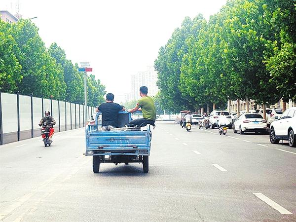 6月16日上午,在五一路(太昊路与莲花路段),一辆无牌电动三轮车载着两名市民在机动车道上疾驰,三轮车厢内一名市民蹲坐着,一名市民则坐在三轮车侧边。由于三轮车平衡性能差,容易发生侧翻等交通事故,车上人员均未佩戴安全头盔,这种行为既不文明又不安全。 记者 王慕晨 摄