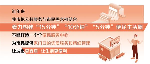 15分钟可以走多远?按照成年人步行每小时4至5公里的速度计算,15分钟可以步行1公里至1.5公里。建设“15分钟便民生活圈”,也就是保证社区居民在半径1.5公里的范围内可以获得日常生活所需要的全部服务。今年以来,我市以“便民、利民、惠民”为出发点,以改善民生、服务民众为导向,在示范区打造7个便民服务中心,构建“15分钟”“10分钟”“5分钟”便民生活圈,让辖区居民出门即可享受日常政务服务、品质消费、健身娱乐、养老托幼、就学就医、绿色出行等服务,让便民服务抬眼可见、触手可及、迈步可达,真正把群众的“需求清单”转化为“幸福清单”。