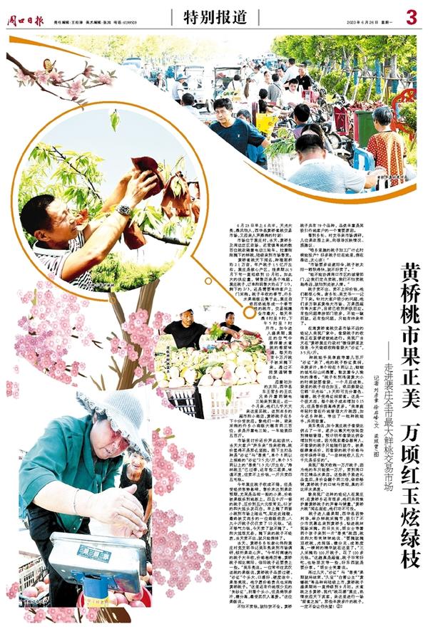当天,黄桥乡乡长谢化伟和裴庄村党支部书记吴东亮来到市场调研,倾听果农心声。“今年河南境内的桃子大丰收,价格卷得厉害,黄桥桃子相比南阳、信阳桃子还要贵上一些。”吴东亮说。一位常年往武汉送桃的果贩说,黄桥桃子品质过硬,“沙红”个头大、口感好、硬度适中、果形美观,他宁愿价格贵点也采购黄桥桃子。“这里还有外地很少见的‘朱砂红’,别看个头小,但是绵软多汁,糖分高,最受武汉人喜爱。”这位果贩说。