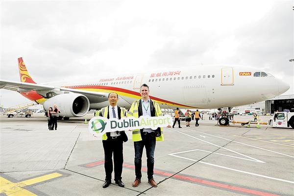 6月27日,在爱尔兰首都都柏林,都柏林机场负责航空业务发展的副总裁约恩·麦格洛林(右)与中方工作人员在中国海南航空公司客机前合影。